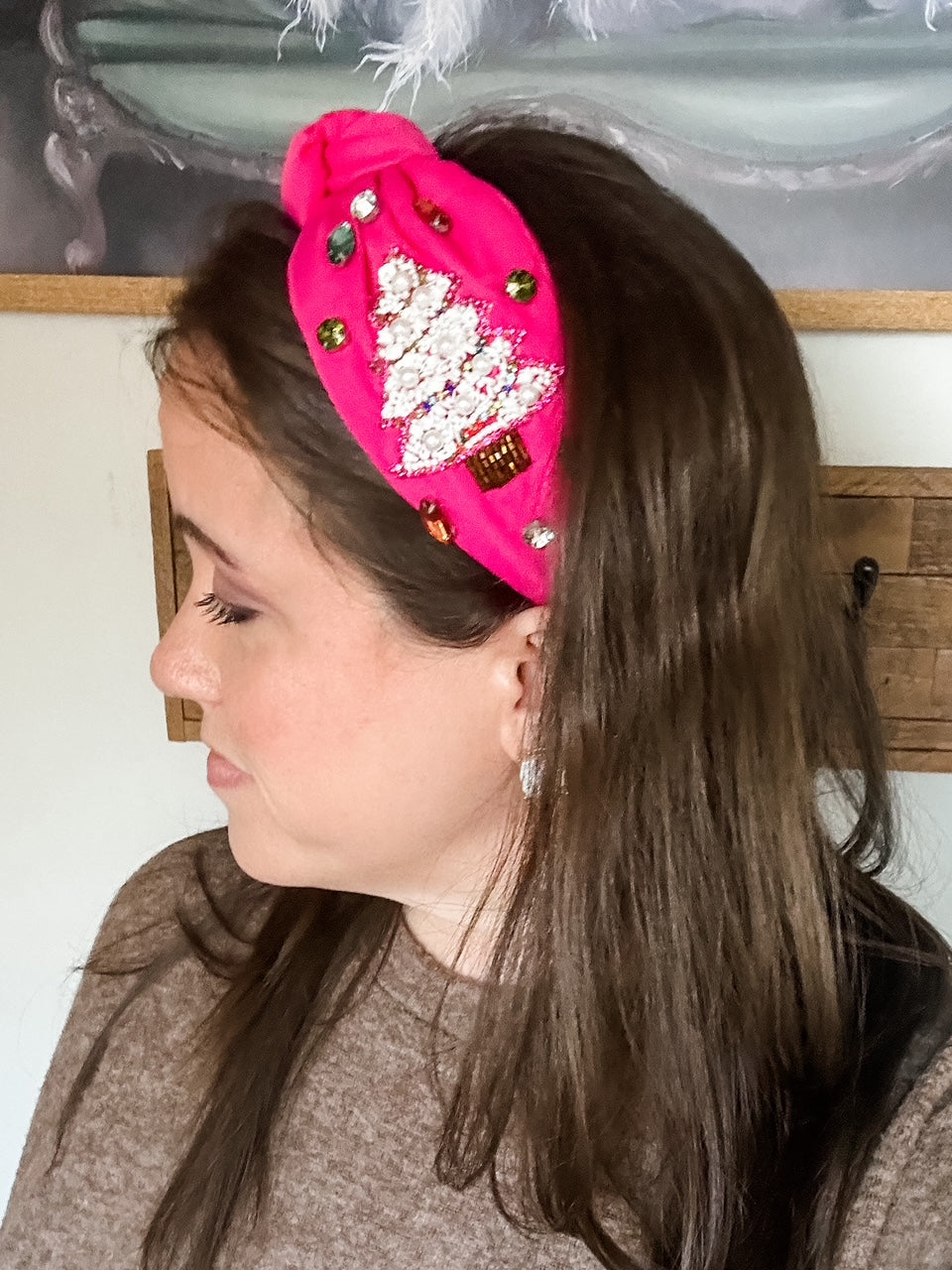hot pink Christmas headband, beaded Christmas tree headband, rhinestone holiday headband, embellished holiday party headband, pink padded Christmas headband, festive holiday hair accessory, statement Christmas headband, bold color holiday headband, Christmas tree beaded hairband, holiday hair accessory for women, sparkly Christmas headband, pink holiday party headband, winter holiday hair accessory, rhinestone embellished Christmas headband, Christmas morning photo headband, fun holiday headband, jeweled Christmas headband, pink Christmas tree hair accessory, festive party headband for women, colorful Christmas headband