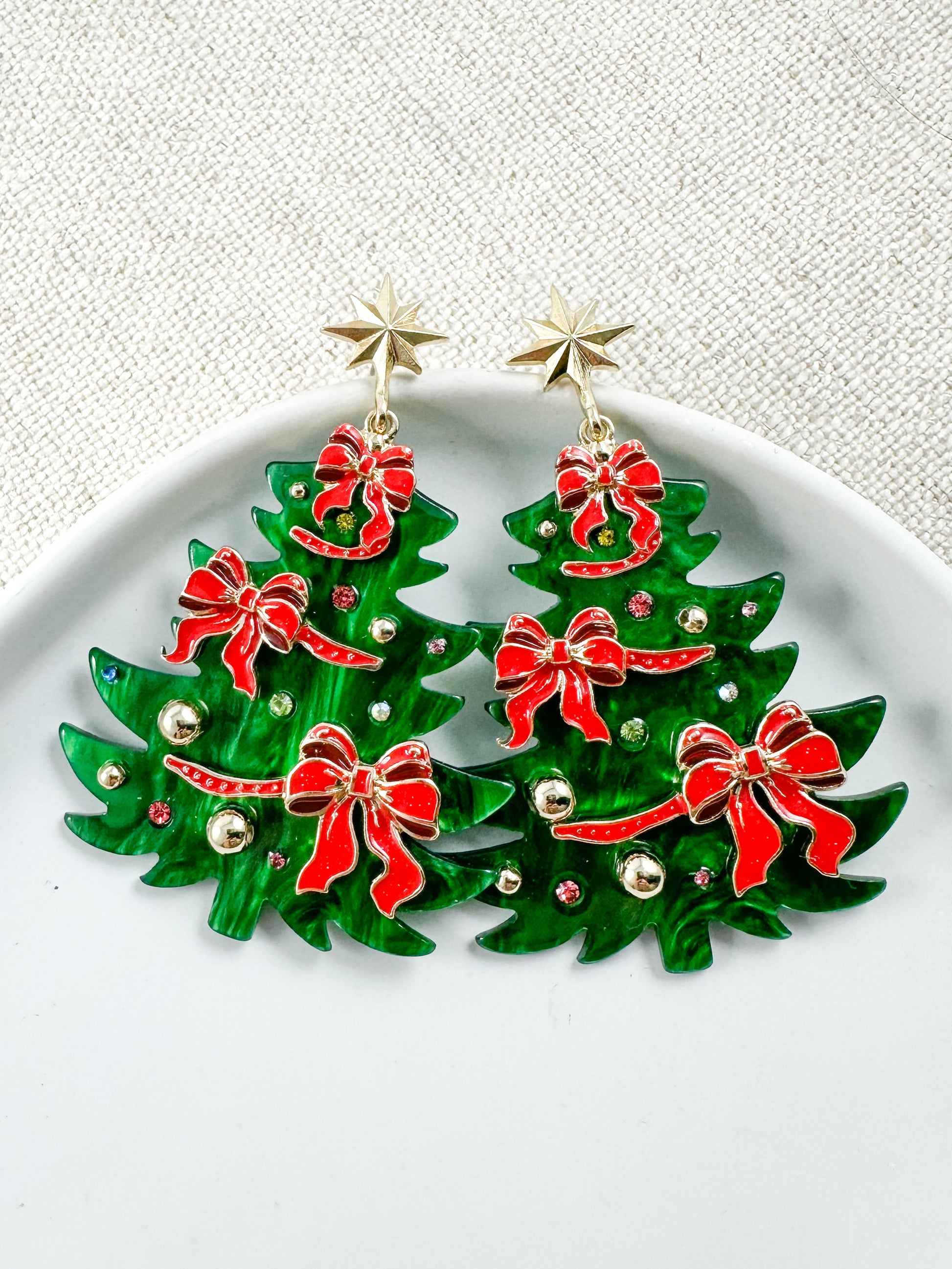 green Christmas tree earrings, red bow holiday earrings, festive statement earrings, bold holiday earrings, maximalist holiday jewelry, Christmas earrings with metallic details, whimsical statement earrings, enamel Christmas earrings, holiday jewelry with bows, oversized earrings for holidays, retro Christmas tree earrings, playful holiday accessories, colorful Christmas earrings, festive fashion earrings, holiday glam earrings, dopamine dressing accessories, statement dangle earrings, Christmas earrings with sparkle, viral holiday earrings, boutique Christmas earrings, holiday earrings for gifting, trendy holiday earrings, red and green earrings, Christmas party outfit accessories, Christmas tree earrings with charm, giftable festive jewelry, holiday earrings for women, trendy statement earrings, holiday earrings inspired by vintage style, Christmas earrings with gold accents