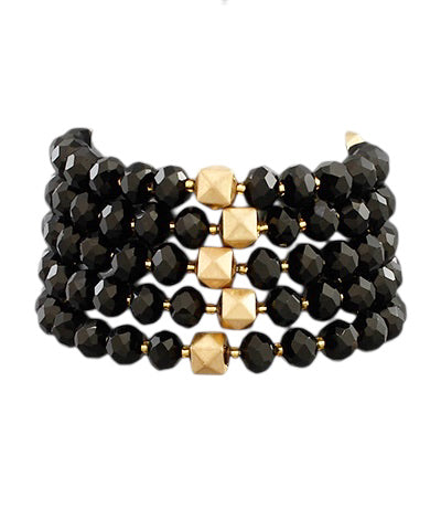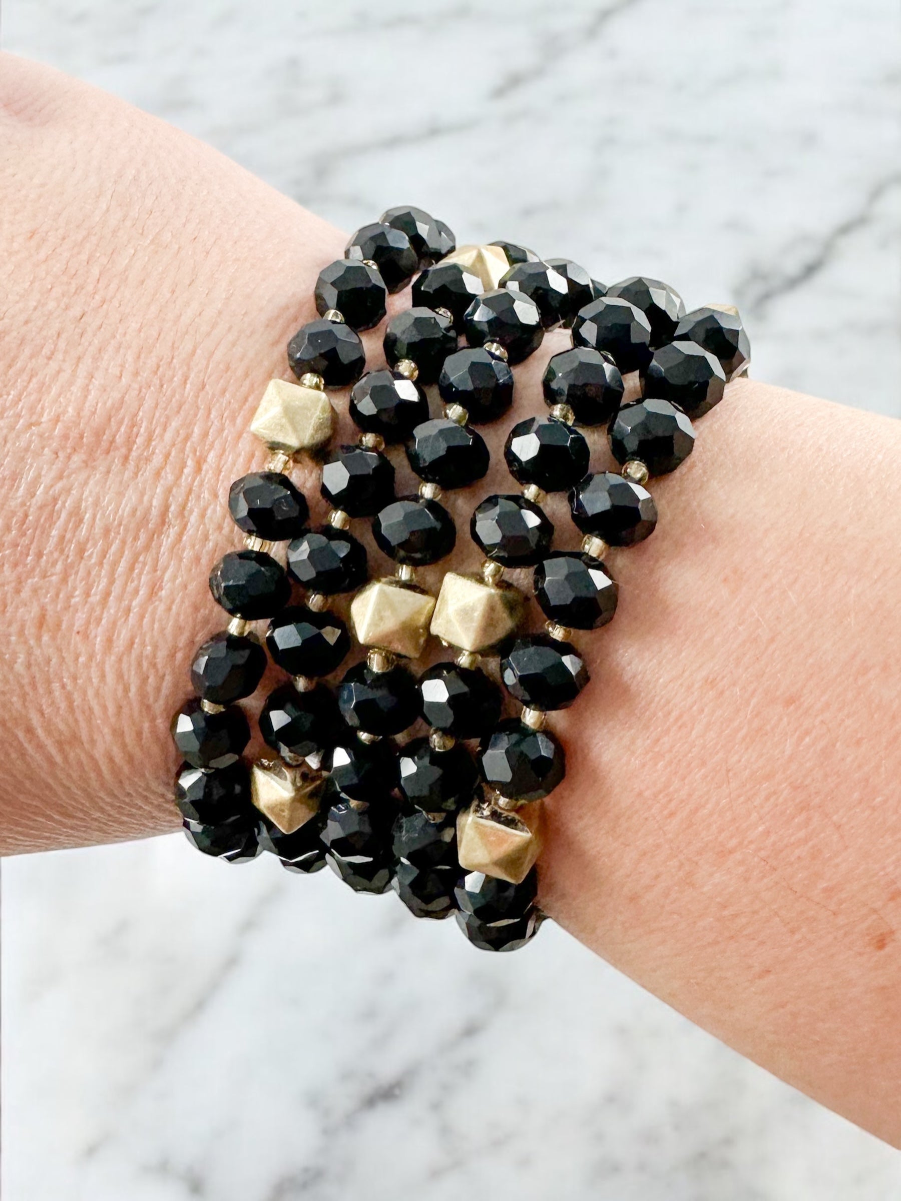 Five stretchy strands of glossy black faceted beads, accented with edgy gold studs, stack together for just the right mix of sleek and bold. This set slips on easily—no clasp, no fuss—and instantly makes any outfit feel pulled together.