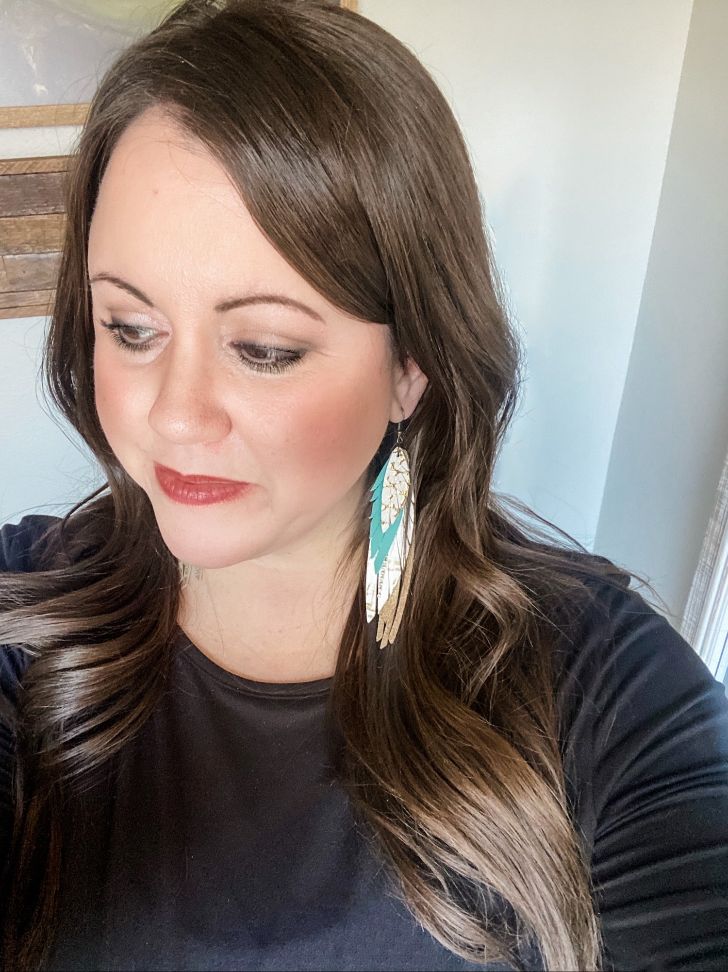 How amazing are these leather feather fringe earrings??? White and turquoise with gold accents...subtle rhinestone and gold chain tassels...AH-MAZING. These earrings are light as a feather--super easy to wear.
