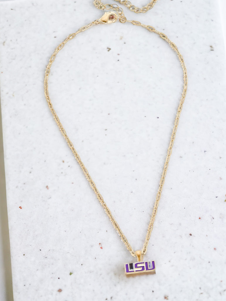 tigers pendant necklace, louisiana team necklace, purple and yellow necklace, officially licensed necklace, NCAA fan jewelry, game day pendant necklace, chain link fan necklace, adjustable team necklace, 16 inch charm necklace, sports fan necklace for women, tigers fan jewelry, louisiana pride necklace, round enamel pendant necklace, college team colors necklace, purple and gold accessories, licensed sports necklace, boutique game day jewelry, subtle fan necklace, small sports pendant, gold tone fan necklace, everyday game day necklace, tigers inspired accessories, team spirit necklace, necklace with extender, minimal sports fan necklace, dainty college pendant necklace, stylish fan gear, lightweight tigers necklace, cute sports necklace for gifting