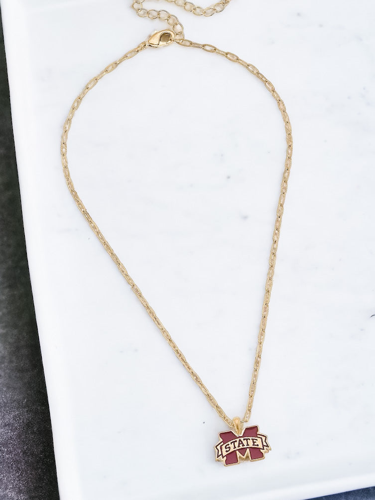 mississippi maroon and white necklace, college team color necklace, game day necklace for women, officially licensed NCAA necklace, 16 inch fan necklace, adjustable sports necklace, maroon fan jewelry, mississippi pride accessories, subtle game day necklace, lightweight college necklace, boutique game day jewelry, everyday team spirit necklace, mississippi gameday accessories, maroon and white fan necklace, state pride necklace