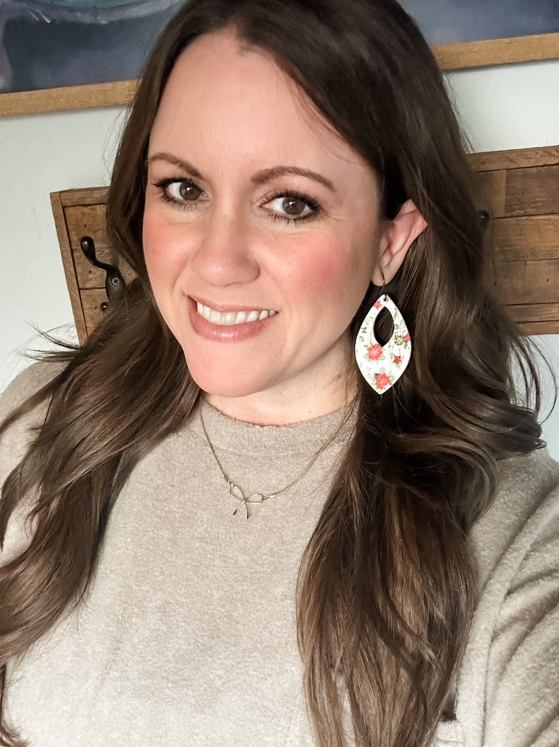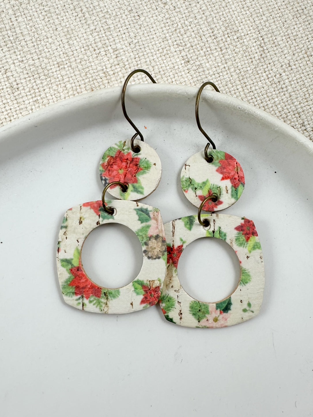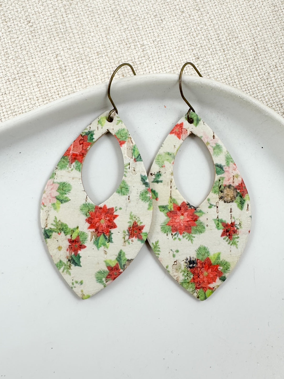Winter Poinsettia Cork has a soft cream base with little red and pink poinsettias scattered across it, along with bits of birch texture that show through the print. The colors are warm and classic, and every cut of the sheet looks a little different, which makes each pair its own.