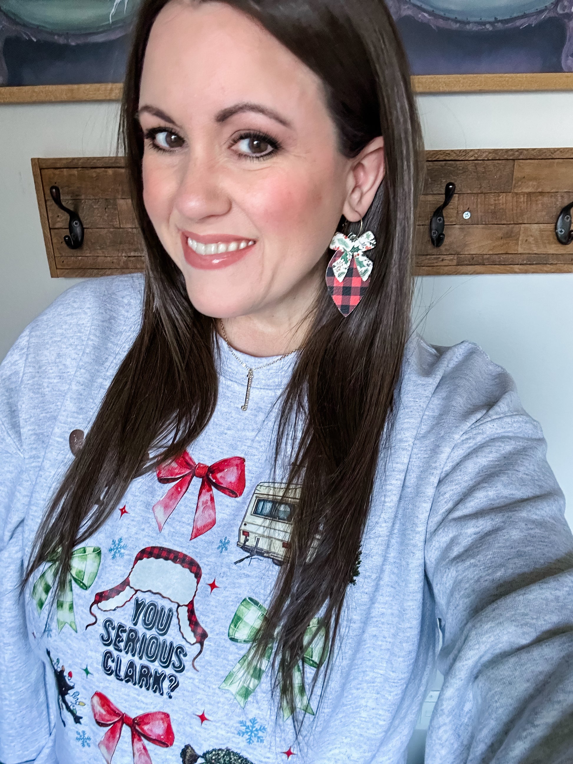 Handmade red plaid leather bow earrings with floral details — the Woodland Noel Earrings bring cozy cabin vibes and Christmas cheer to every outfit. 🎄