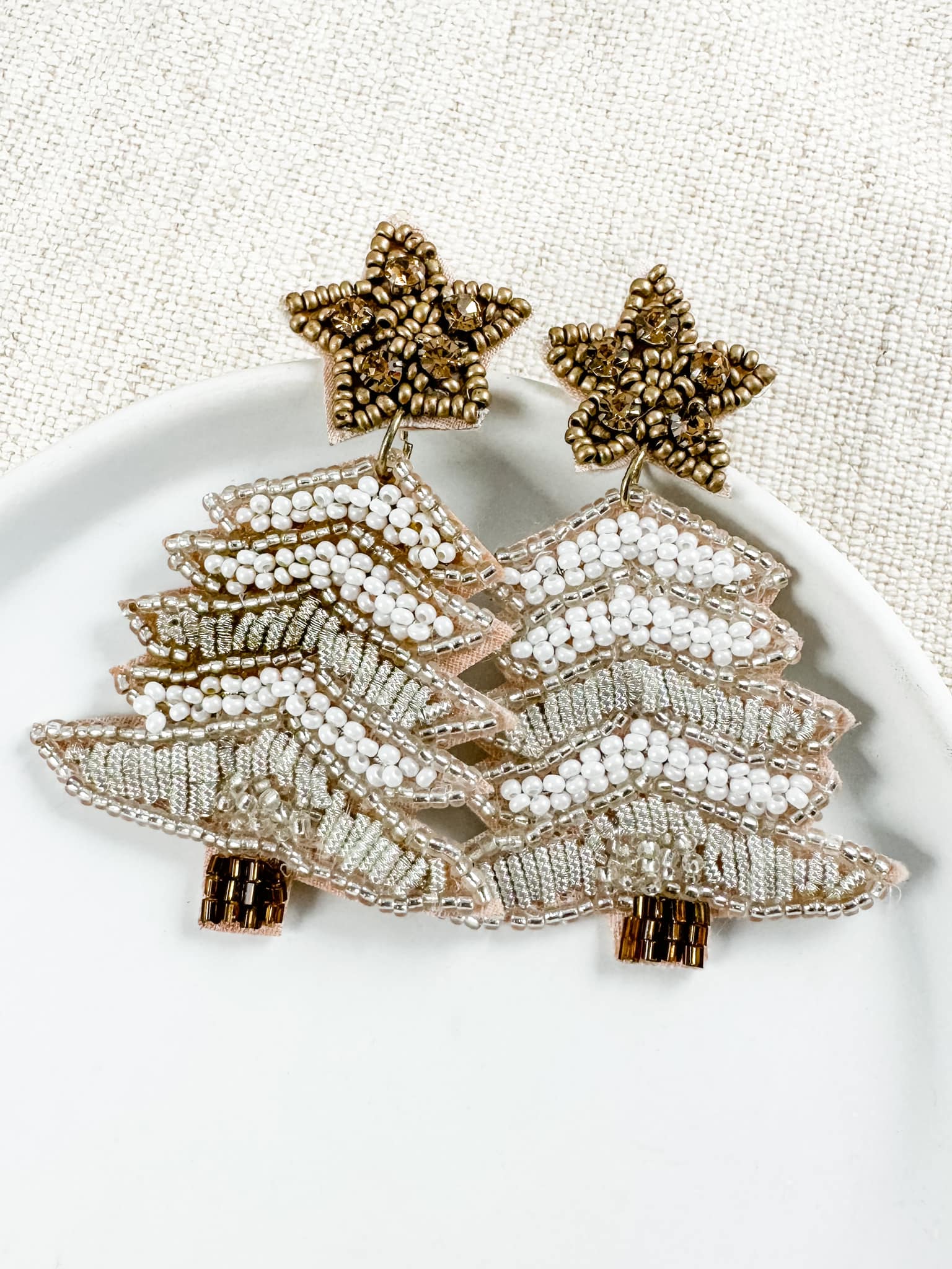 ivory beaded Christmas tree earrings, holiday statement earrings, glam Christmas earrings, white holiday earrings, festive beaded earrings, ivory tree drop earrings, Christmas party accessories, dressy holiday earrings, neutral Christmas earrings, ivory and gold statement earrings, winter party earrings, handmade holiday earrings, bold beaded earrings, fancy Christmas tree earrings, beaded statement studs, holiday glam earrings, gift for Christmas party hostess, Christmas tree earrings with pearls, upscale Christmas earrings, sparkly holiday earrings, white tree earrings for winter events